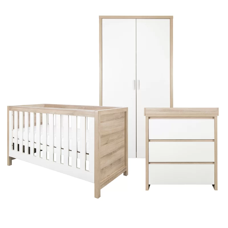 Transform your baby’s nursery into a serene and functional space with the Tutti Bambini Modena 3 Piece Room Set. This beautifully crafted set includes a convertible cot bed, a spacious dresser with a changing table, and a full-sized wardrobe, all designed to grow with your child. Featuring a contemporary white and oak finish, the Modena set blends seamlessly with any nursery décor.